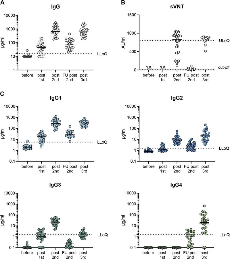 3回接種直後でも2回接種直後と同等(IgG1)かそれ以下(IgG3)です。
